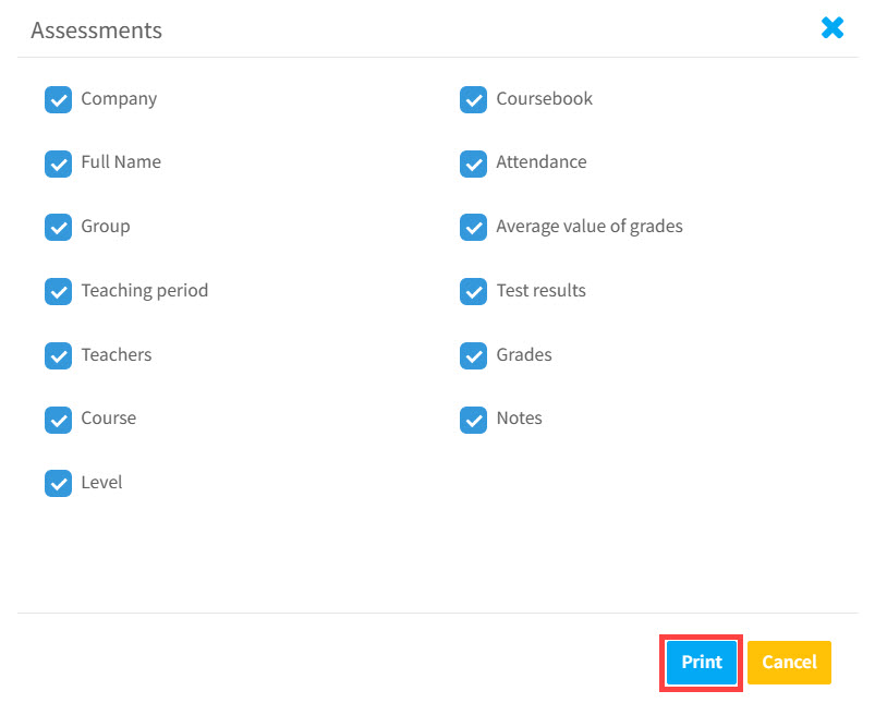 Clicking “Print” will send Assessments to all the students in the selected groups with email addresses.